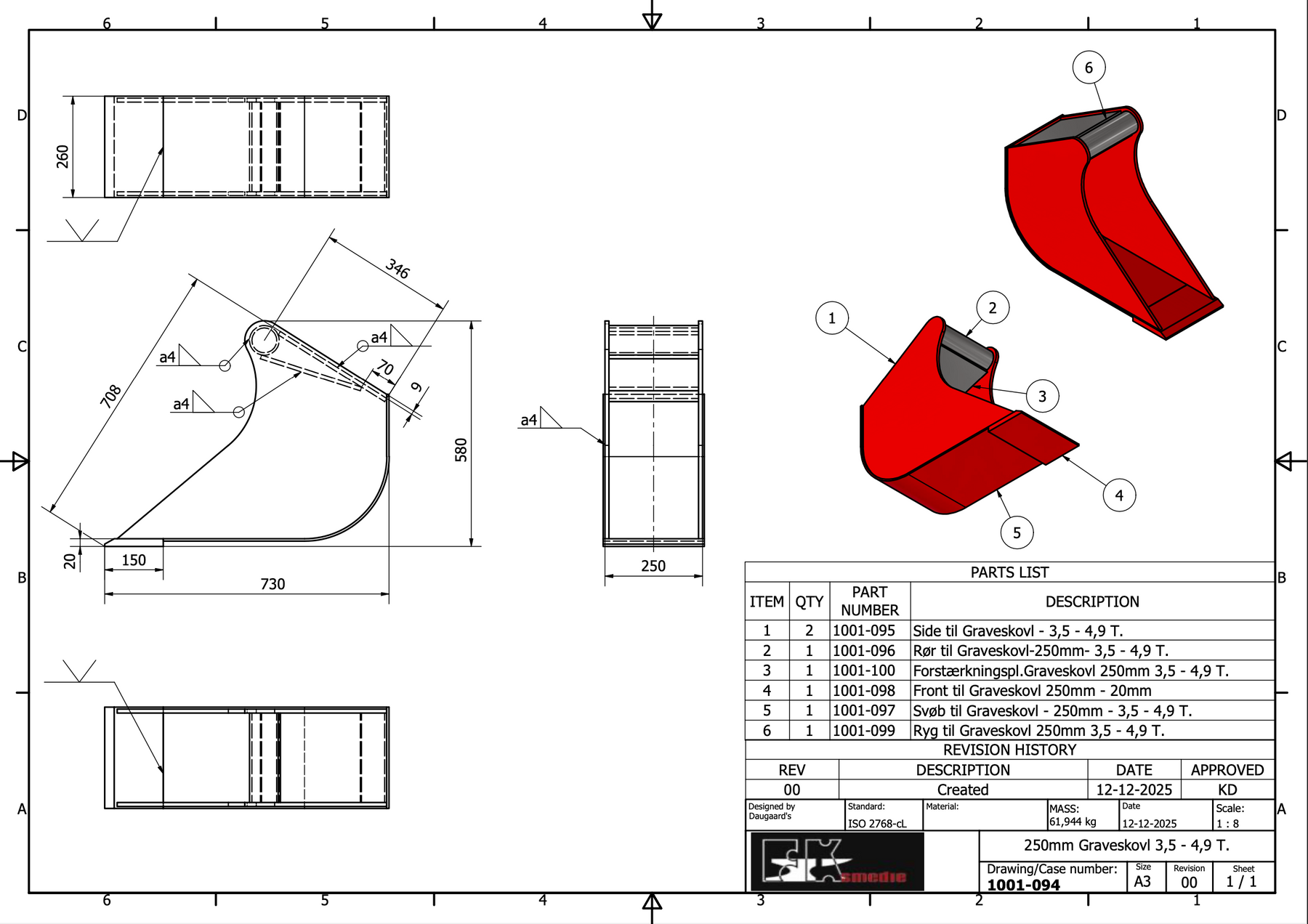 Skovlene er hovedsageligt fremstillet i Hardox, som på tegningen er markeret med rød farve. Øvrige dele af skovlen udføres som minimum i S355-stål, hvilket sikrer høj styrke og lang levetid.