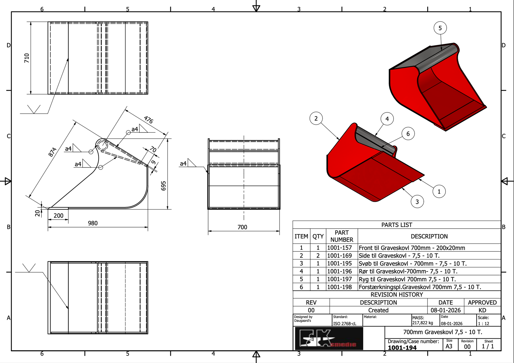 Skovlene er hovedsageligt fremstillet i Hardox, som på tegningen er markeret med rød farve. Øvrige dele af skovlen udføres som minimum i S355-stål, hvilket sikrer høj styrke og lang levetid.