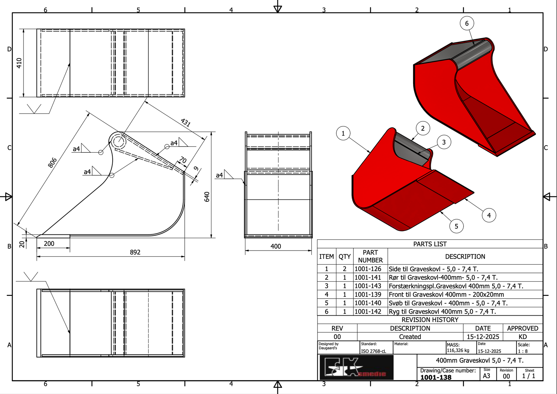 Skovlene er hovedsageligt fremstillet i Hardox, som på tegningen er markeret med rød farve. Øvrige dele af skovlen udføres som minimum i S355-stål, hvilket sikrer høj styrke og lang levetid.